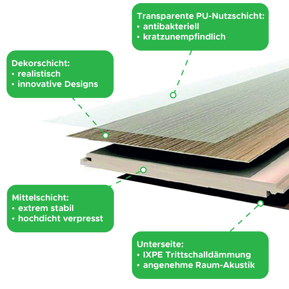 Aufbau: Mehrschichtenaufbau mit Trittschalldämmung, Synchronprägung (bei Holzdesigns) und kratzbeständiger Oberfläche