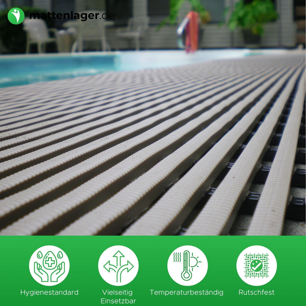 Die praktische Antirutschmatte ist vielseitig einsetzbar. Zum Einen kann sie in Dusch-, und Umkleideräumen oder auch in Waschküchen ihre Anwendung finden. Zum Anderen wird sie als Läufer rund um den Barfußbereich in Schwimmbädern eingesetzt. Auch in Saunen, Whirlpools sowie in Fitnessstudios erfüllt die Hygienematte ihre Aufgabe.