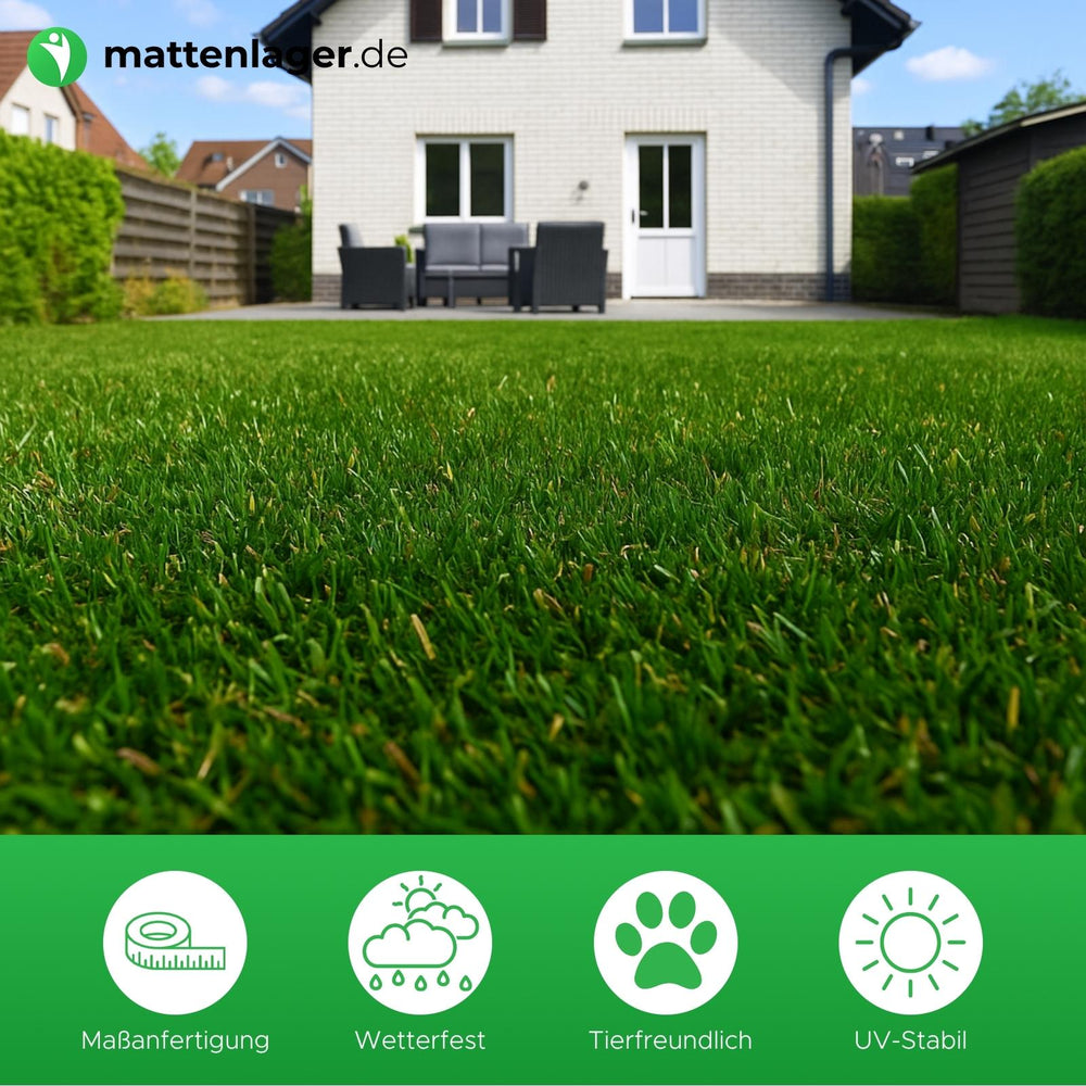 Mit dem Kunstrasen BLADE holen Sie sich die Schönheit eines echten Rasens in Ihren Garten, auf Ihre Terrasse oder den Balkon – ganz ohne Pflegeaufwand! Dank der speziellen Struktur und der Verwendung hochwertiger Materialien sorgt der Kunstrasen BLADE für eine besonders naturgetreue Optik, die Ihre Außenbereiche in einem satten, frischen Grün erstrahlen lässt. Die zweifarbigen, C-förmigen Fasern und die hohe Dichte von 16.800 Stichen pro m² machen diesen Kunstrasen besonders robust und belastbar, perfekt für anspruchsvolle Anwendungen.