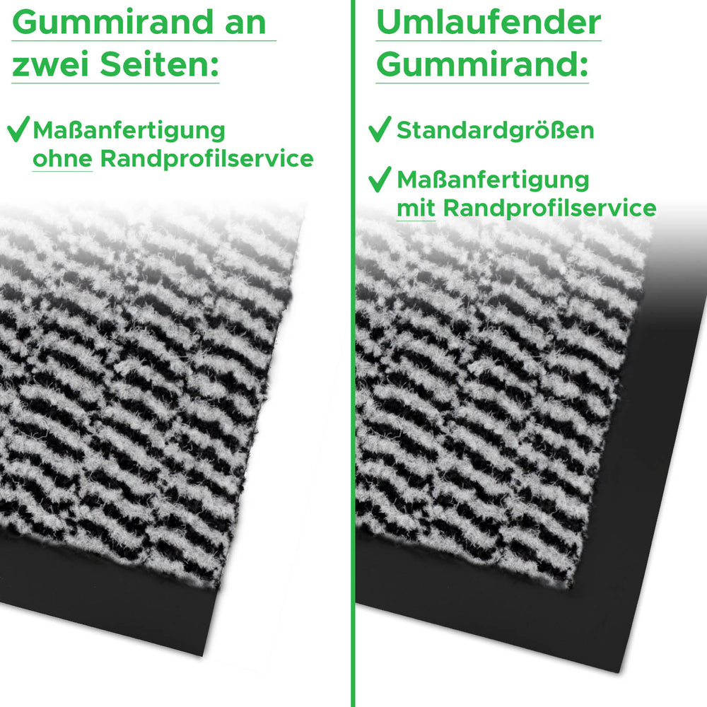 Bei der Maßanfertigung wird die Schmutzfangmatte von der Rolle "runtergeschnitten". Daher gibt es bei Zuschnitten keinen umlaufenden Gummirand (nur an zwei gegenüberliegenden Seiten). Nutzen Sie den Randprofilservice für Schmutzfangmatten, um einen umlaufenden Rand für auf Maß gefertigte Schmutzfangmatten hinzuzufügen.