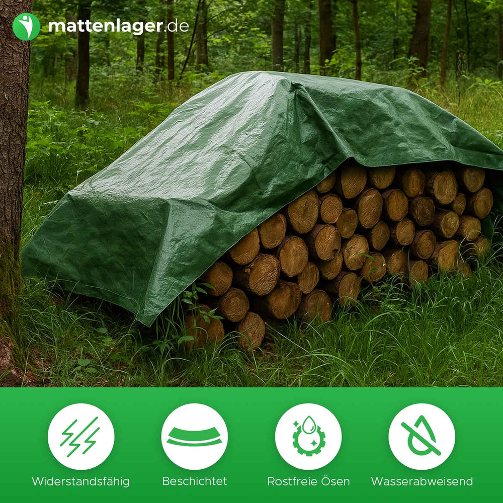Die Plane verfügt über verstärkte Kanten und stabile Metallösen, die eine sichere Befestigung selbst unter schwierigen Bedingungen ermöglichen. Mit den praktischen Größen zwischen 2 x 2 m und 12 x 15 m ist sie vielseitig einsetzbar – ideal für die Abdeckung von Fahrzeugen, Baugeräten, großen Holzstapeln oder anderen Gegenständen, die einen besonders robusten Schutz benötigen.