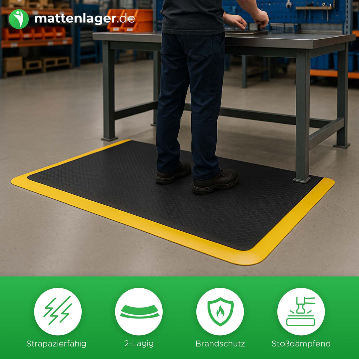 Die sehr robuste und hochwertige Anti-Ermüdungsmatte aus zwei Lagen eignet sich besonders in Arbeitsbereichen mit häufigem Laufen und Stehen. Der ergonomische Aufbau sowie die Diamondstruktur bilden eine hochwertige Antirutsch-Matte auf der das Ausrutschen nicht nur erheblich reduziert wird sondern auch der Stehkomfort erhöht wird und somit Knie und Gelenke signifikant entlastet werden.