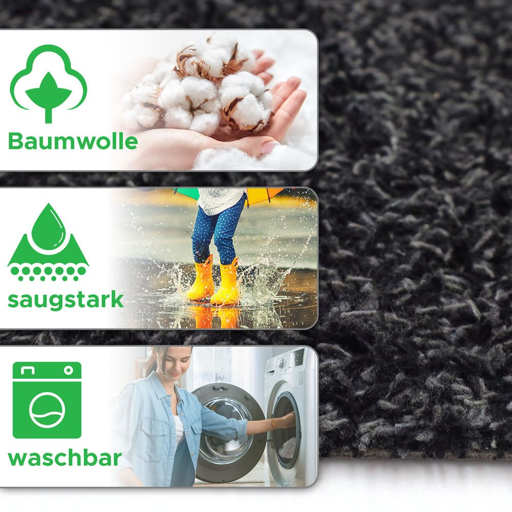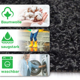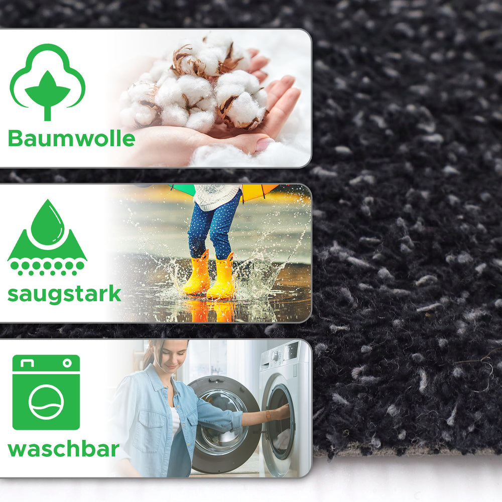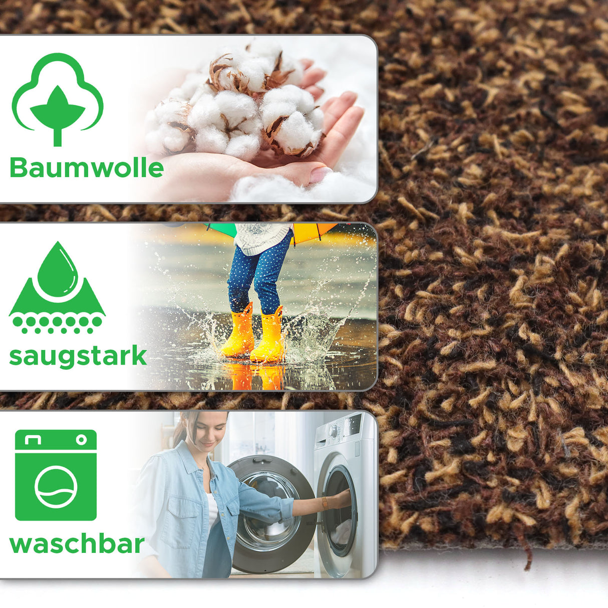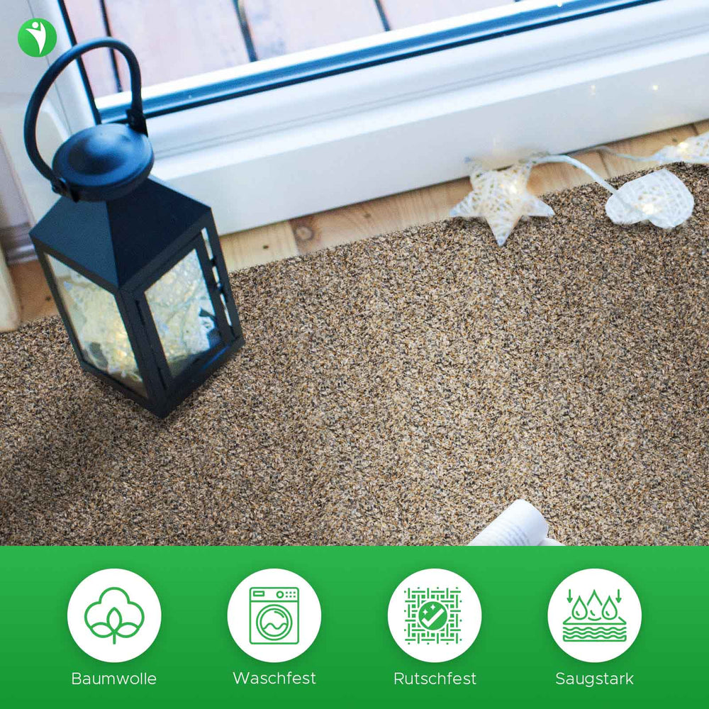 Die DEAN Eingangsmatte bietet die perfekte Kombination aus Funktionalität, Komfort und Design. Gefertigt aus einer robusten Mischung von 80 % Baumwolle und 20 % Polyester, sorgt sie dafür, dass Schmutz, Staub und Nässe zuverlässig von Ihren Schuhen aufgenommen werden. Die speziellen 5-7 mm hohen Baumwoll-Mischgewebe-Fasern fangen Partikel sicher auf und halten bis zu 3,7 l/m² Feuchtigkeit, wodurch Ihr Eingangsbereich, Büro oder Geschäft stets sauber und trocken bleibt.