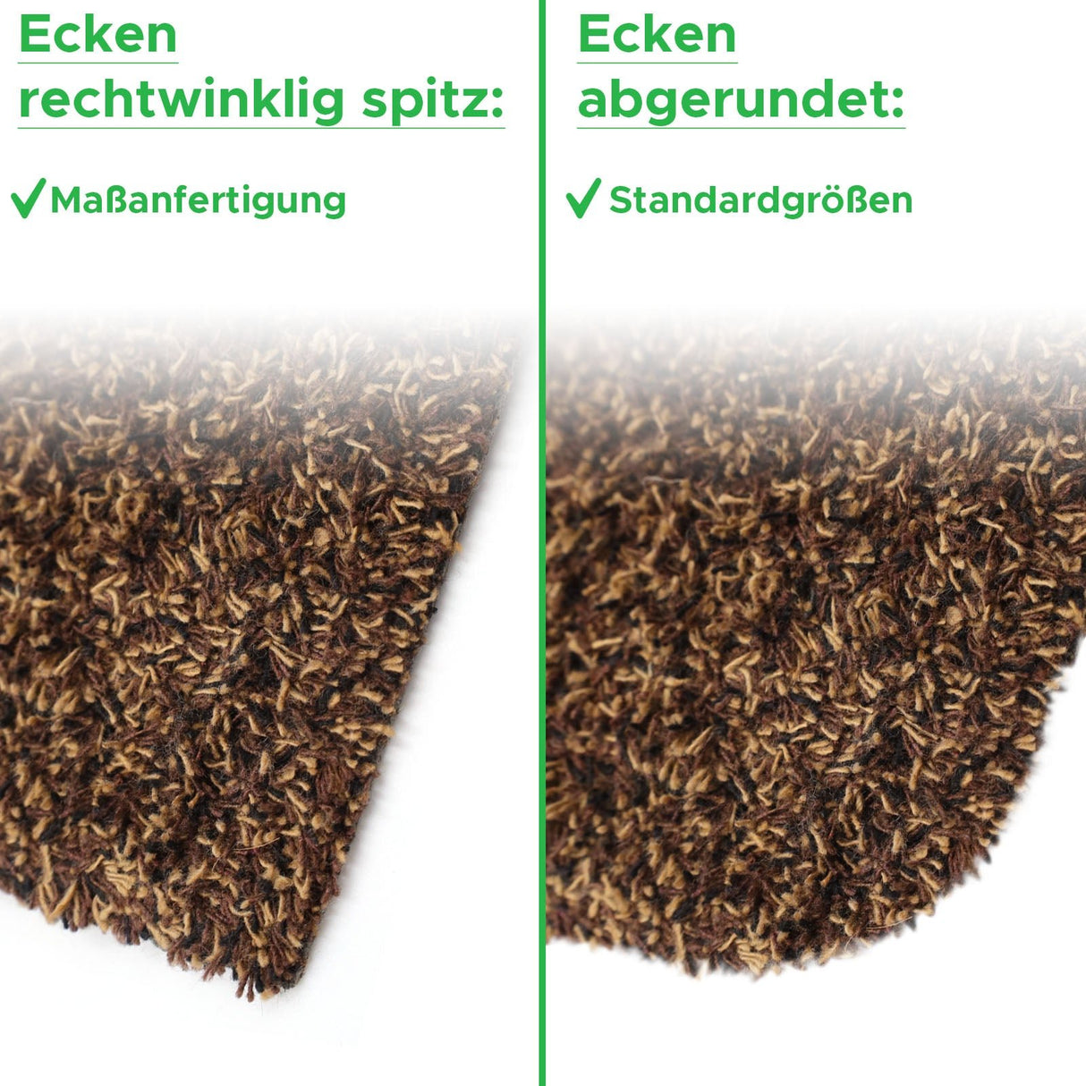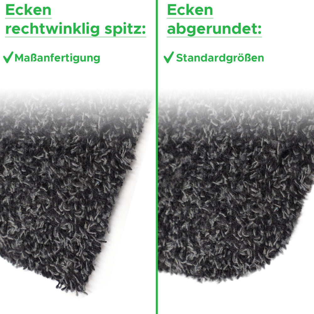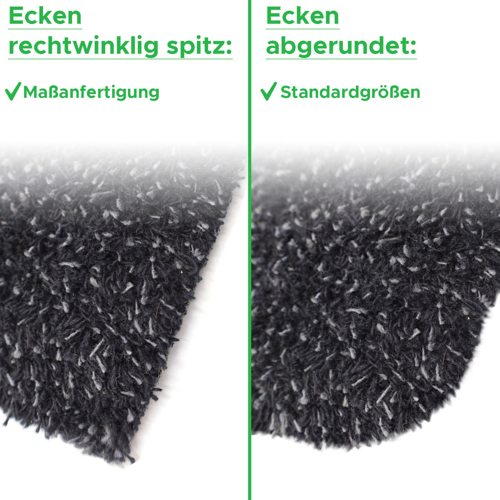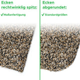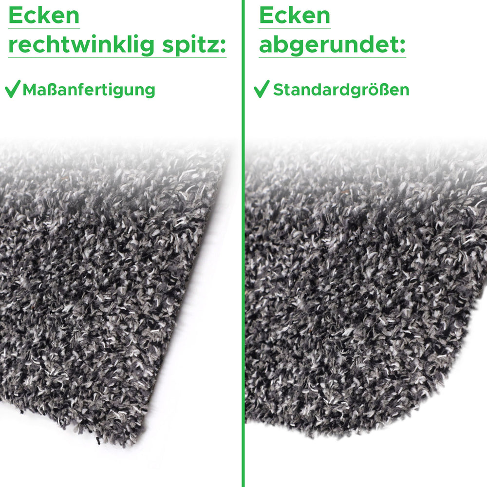 Nutzen Sie für die optimal passende Größe der Eingangsmatte DEAN aus Baumwolle unseren Maßanfertigungs-Service. Wählen Sie zwischen einer Breite von 100 cm bis 200 cm und passen Sie die Länge bis zu 15 m individuell an Ihren Flur oder Eingangsbereich an. Dies macht die DEAN Matte zur idealen Lösung für private Haushalte und gewerbliche Eingänge. Ein wichtiger Hinweis: Bei Maßanfertigungen sind die Ecken nicht abgerundet, sondern bleiben eckig, um eine optimale Anpassung an Ihren Raum zu gewährleisten.