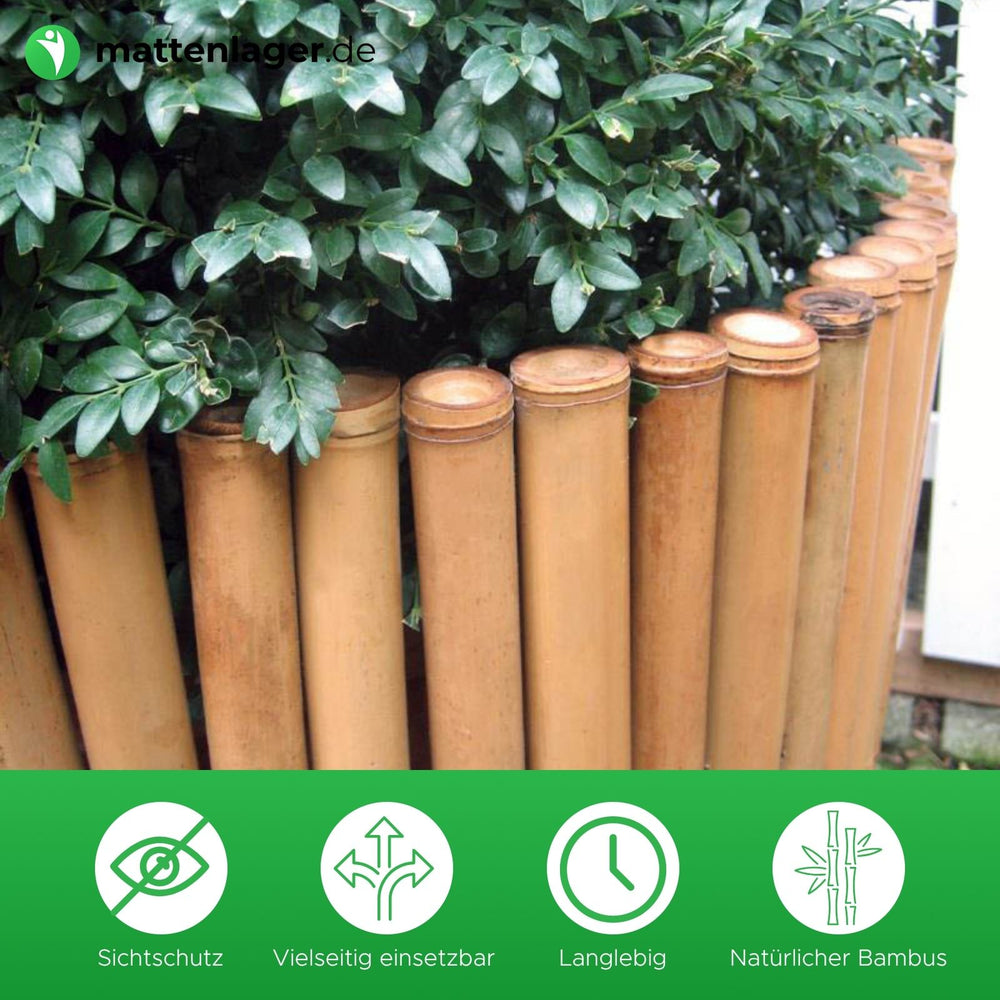 Unser honigfarbener Bambus-Sichtschutz LIAO DELUXE stellt neben einer sehr ansprechenden Ausschmückung ebenfalls einen praktischen Sichtschutz für Ihr Zuhause und Garten dar. Der natürliche Sichtschutz aus vollen Bambusrohren schützt Ihre Privatsphäre in Ihrem Außenbereich. So sind Sie im Garten, auf der Terrasse oder auf dem Balkon stets vor neugierigen Blicken geschützt. Der Bambus-Sichtschutz kann überdies als Raumteiler für Ihr Zuhause dienen und lässt sich flexibel, nach Belieben einsetzen. Die Rohrstärke kann einen Durchmesser bis zu 40mm betragen.
