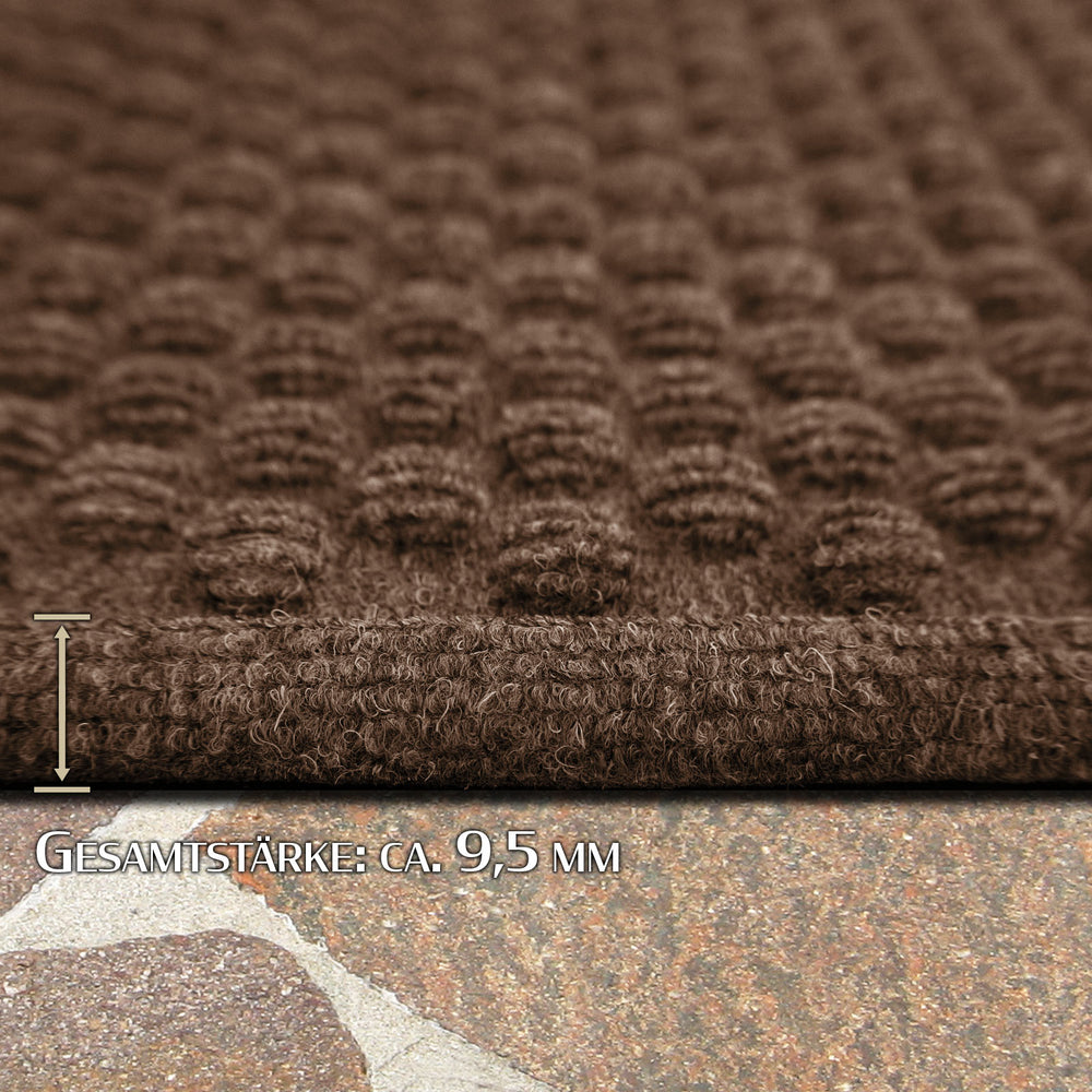 Durch die gepresste Carpet-to-edge Verarbeitung ist ein schöner Übergang zwischen Boden und Schmutzfangmatte gegeben. Die Fußmatte kann deshalb mit vielen verschiedenen Untergründen Ihres Hauseingangs stylisch kombiniert werden.