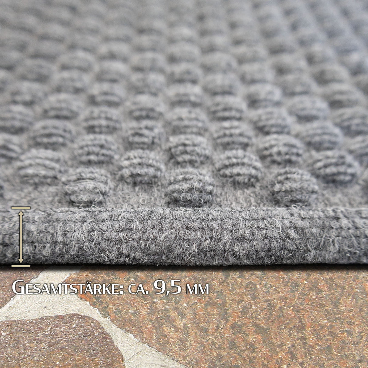 Die Schmutzfangmatten der DOME-Serie eignen sich durch das geprägte Kuppelmuster sehr gut für stark frequentierte Einrichtungen wie Schulen, Restaurants und Supermärkte. Die Gummiunterseite sorgt dafür, dass die Matte stabil liegt und nicht verrutscht. Die Unterseite verfügt außerdem über Noppen, welche bei Nutzung als Outdoor Fußmatte für den Hauseingang dafür sorgen, dass bei Regen Wasser auch unter der Matte abfließen kann und die Matte nicht wegschwimmt. Der sichere Halt bei Nässe wird so gewährleistet.