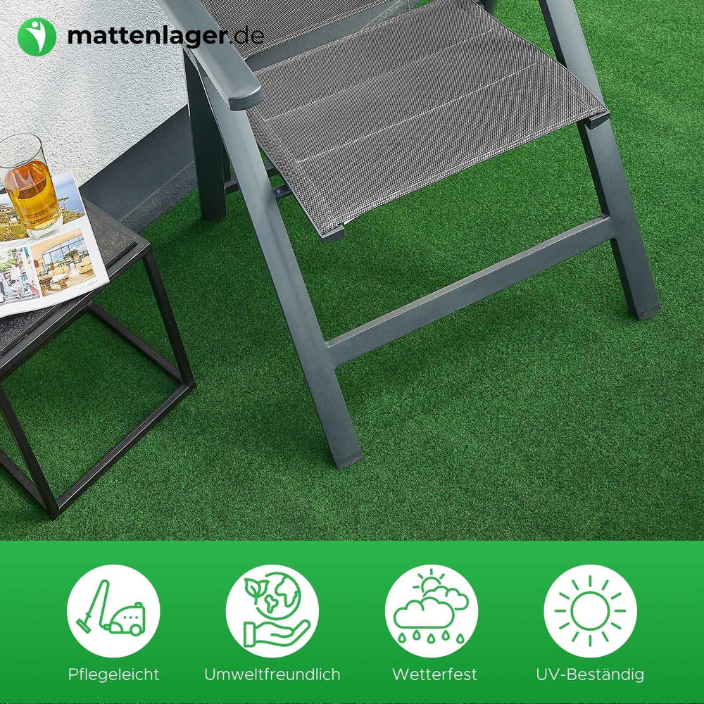 Bringen Sie frisches Grün auf Ihre Terrasse oder Ihren Balkon – mit dem Kunstrasen FLAT, einer nachhaltigen und pflegeleichten Alternative zu echtem Rasen. Hergestellt aus 100 % Polypropylen, überzeugt dieser Kunstrasen durch seine robuste Qualität und einfache Handhabung. Er muss weder gemäht noch bewässert oder gedüngt werden, bleibt das ganze Jahr über gepflegt und sorgt für eine gemütliche Atmosphäre auf Balkon, Terrasse oder gewerblichen Außenbereichen wie Restaurantterrassen oder Café-Gärten.