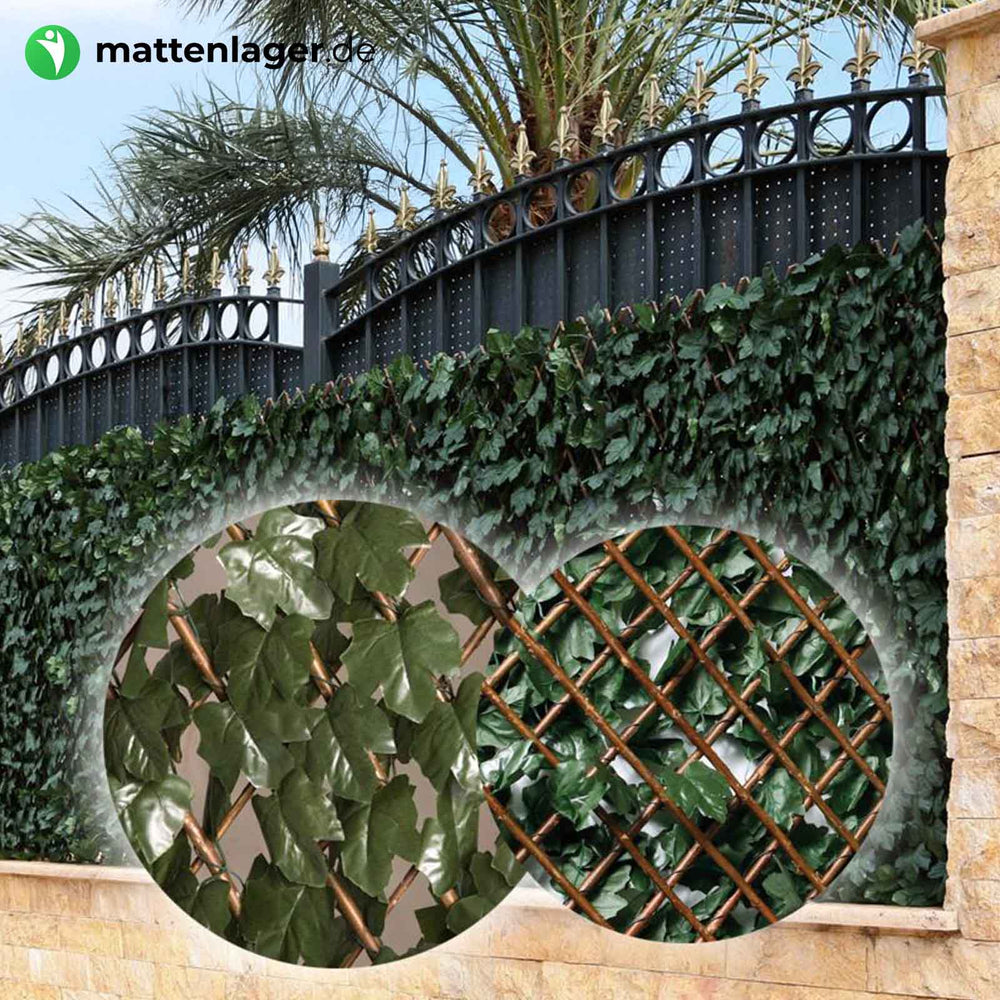 Das Holz Rankgitter LUMRA ist in zwei Varianten erhältlich: als Rankhecke mit künstlichen Efeublättern für einen immergrünen Sichtschutz oder als leeres Holz Rankgitter, auf dem Sie Ihre eigenen Pflanzen hochranken lassen können. Beide Varianten bieten Ihnen die Möglichkeit, sich ganz nach Wunsch einen natürlichen Sichtschutz zu schaffen. Das ausziehbare Gitter kann von einer kompakten Größe auf bis zu 1x2 Meter ausgeweitet werden, was es zu einer flexiblen Lösung für verschiedene Garten- und Balkongrößen macht.