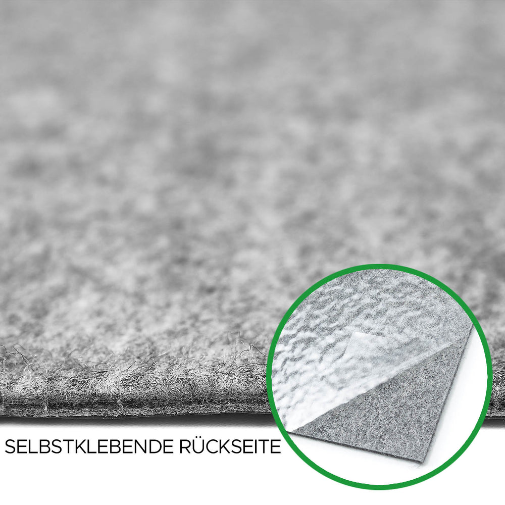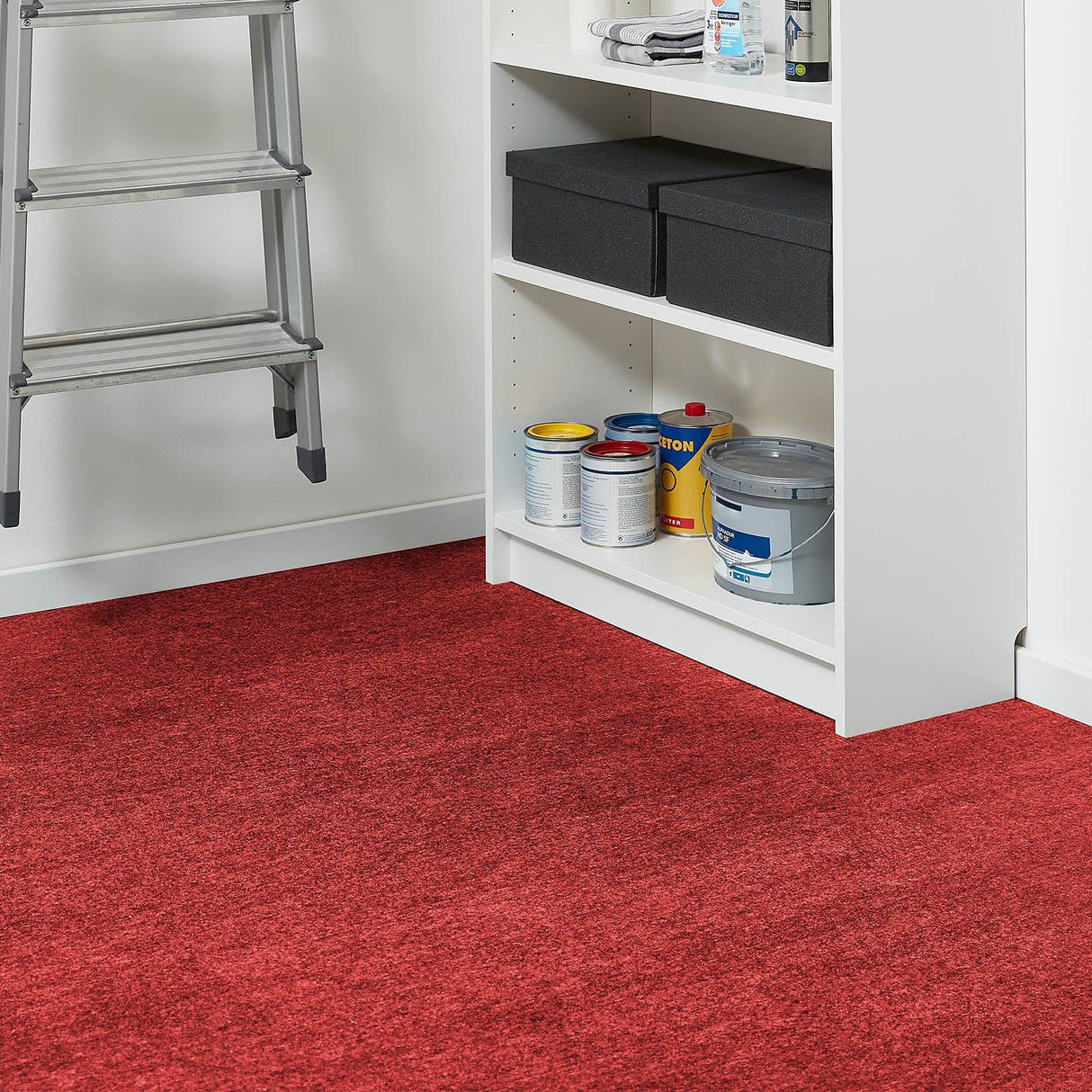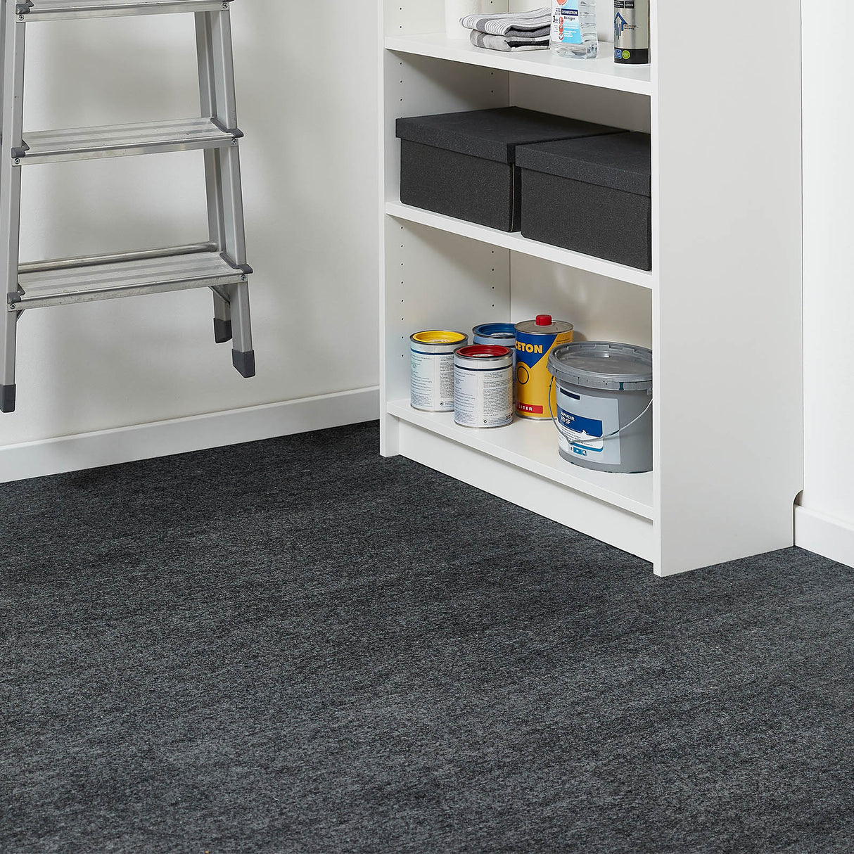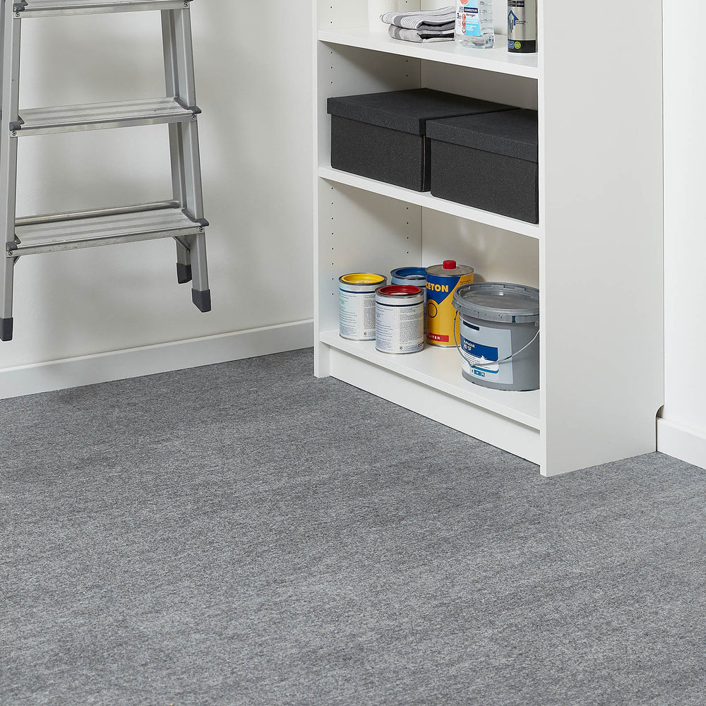 Teppichfliesen aus pflegeleichtem klassischen Nadelfilz und einer Fliesenstärke von 3,5 mm. Die Unterseite der Teppichfliesen ist selbstklebend, was das Verlegen erheblich erleichtert. Die Teppichfliesen verfügen über die Brandklasse Bfl S1 gem. DIN EN 13501-1 und ein ausgezeichnetes Klebevermögen. Sie sorgen für ein angenehmes und sicheres Wohn- oder Büroumfeld. Durch die unempfindliche Oberflächenstruktur der Teppichfliesen ist der Bodenbelag optimal auch für Bereiche mit hoher Trittfrequenz geeignet.