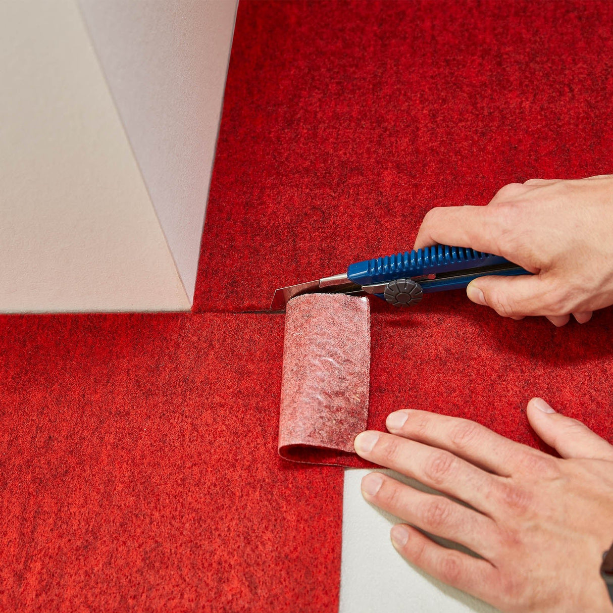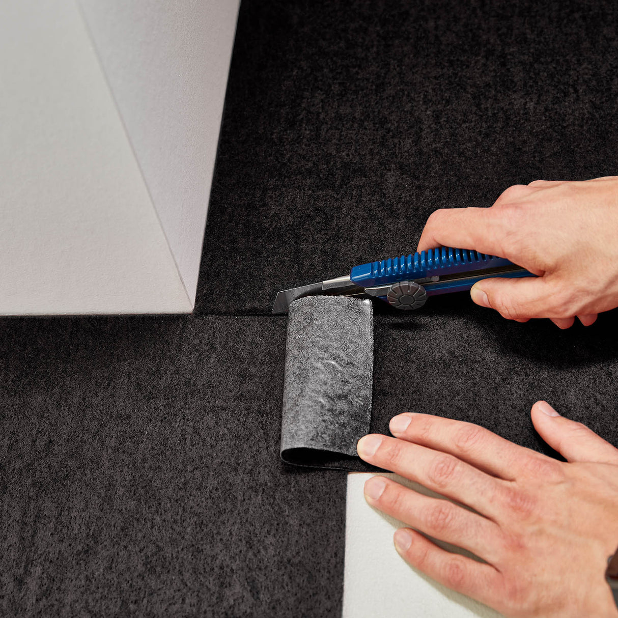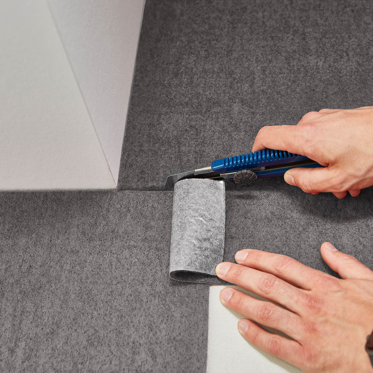 Teppichfliesen aus pflegeleichtem klassischen Nadelfilz und einer Fliesenstärke von 3,5 mm. Die Unterseite der Teppichfliesen ist selbstklebend, was das Verlegen erheblich erleichtert. Die Teppichfliesen verfügen über die Brandklasse Bfl S1 gem. DIN EN 13501-1 und ein ausgezeichnetes Klebevermögen. Sie sorgen für ein angenehmes und sicheres Wohn- oder Büroumfeld. Durch die unempfindliche Oberflächenstruktur der Teppichfliesen ist der Bodenbelag optimal auch für Bereiche mit hoher Trittfrequenz geeignet.